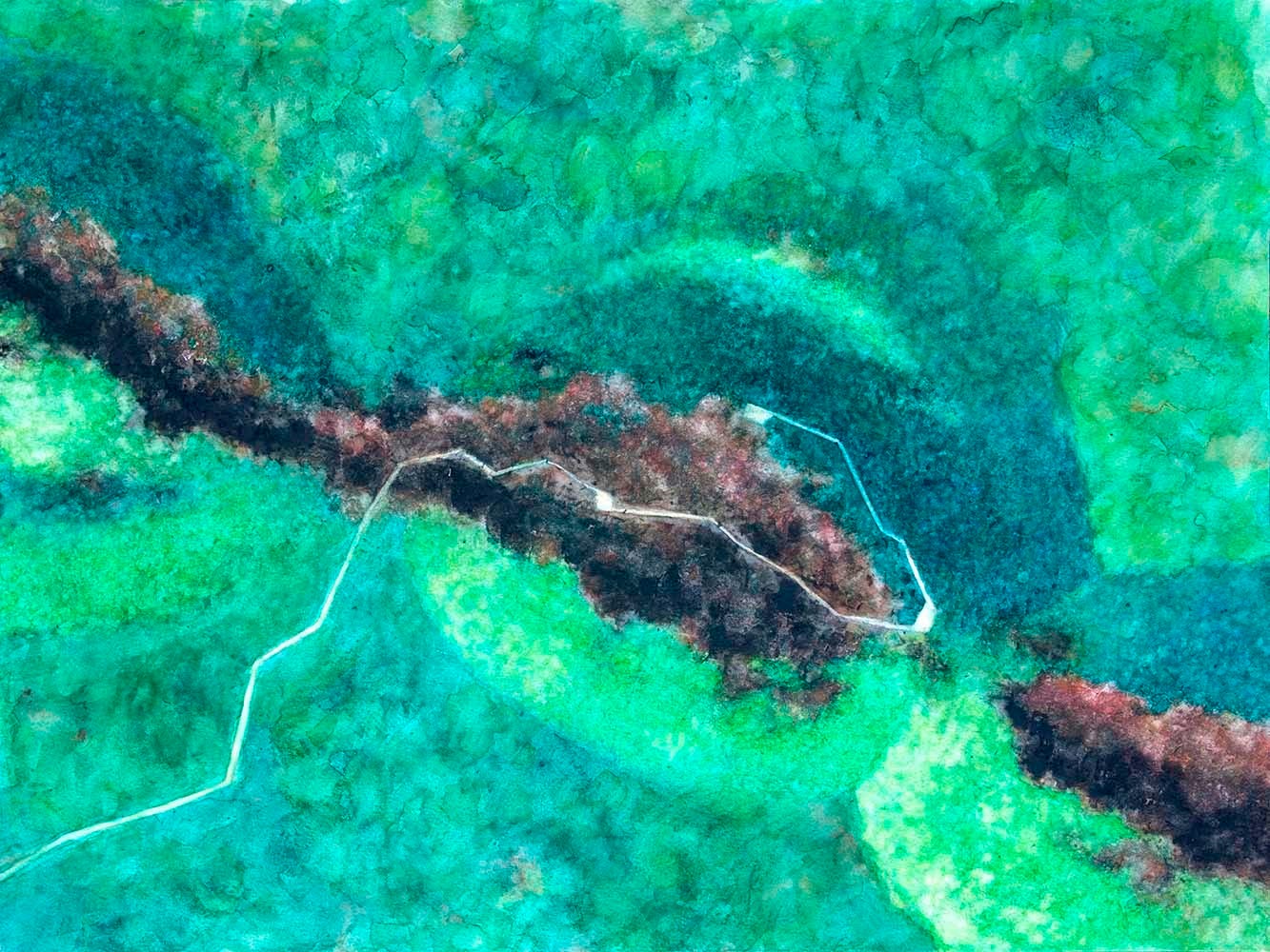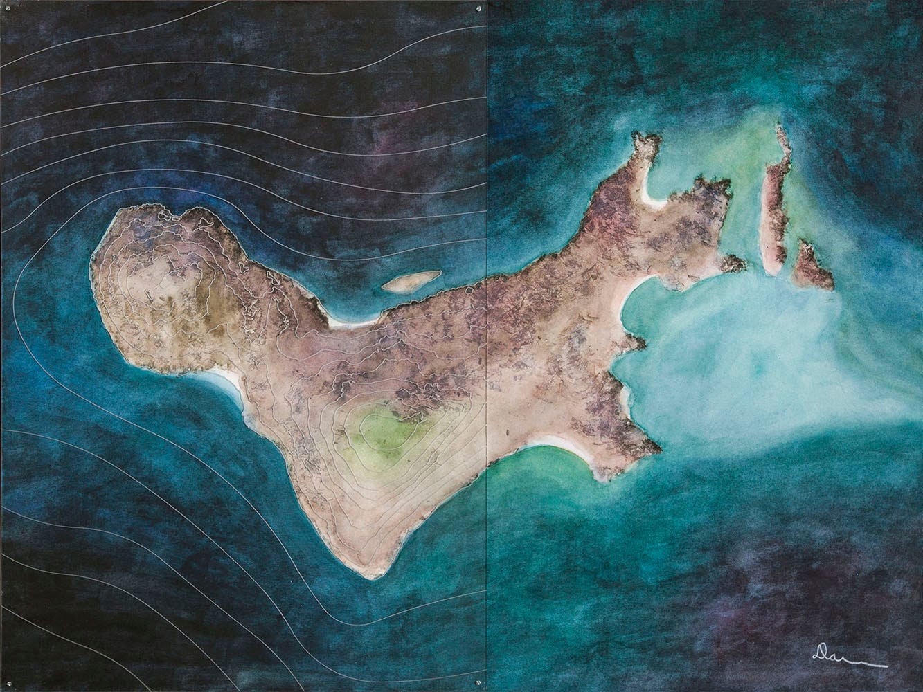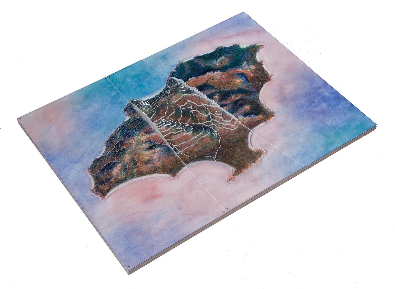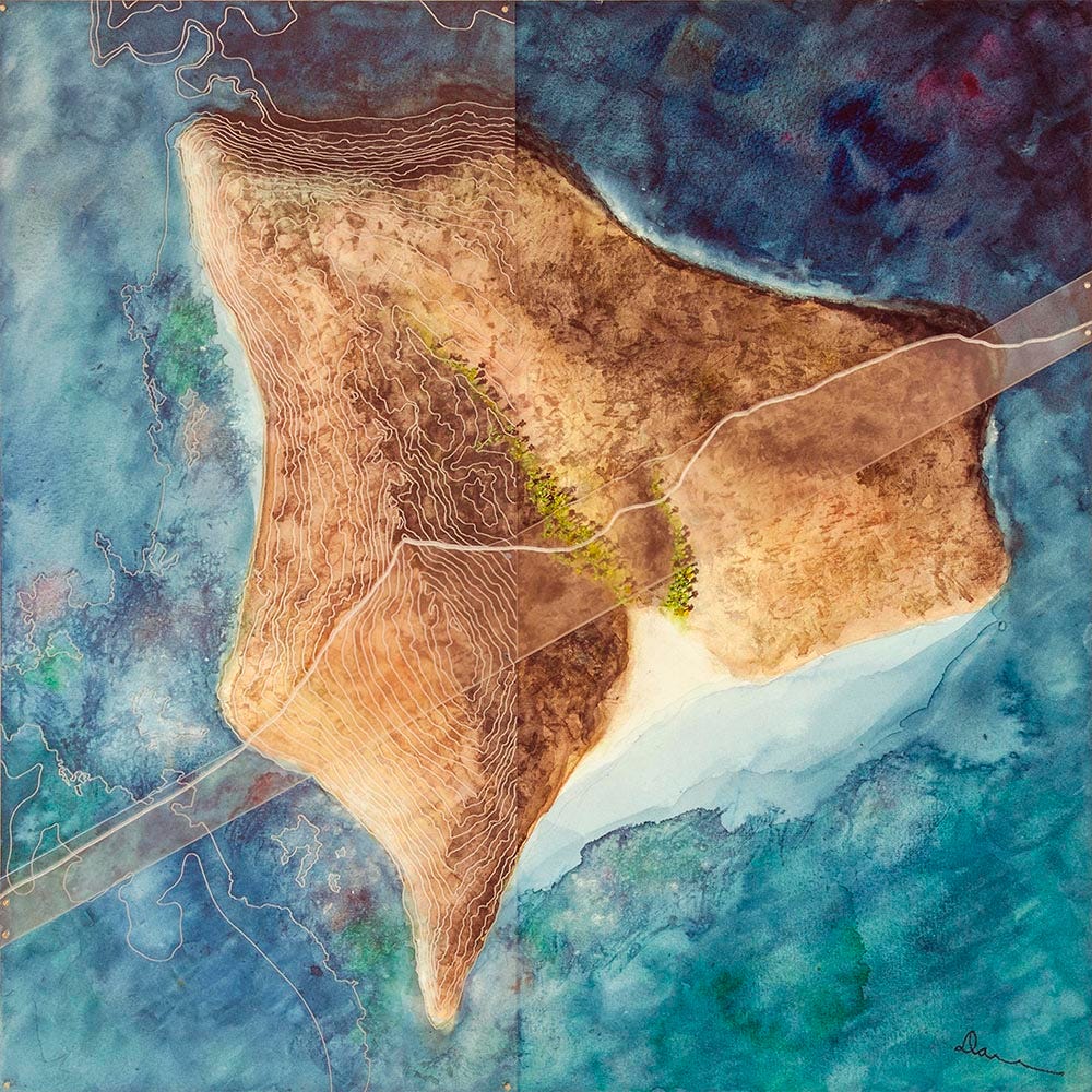 Most of the other islands are each represented only by a single work, and I stuck to plan view for the painting components. With watercolor being a new medium for me I think I still wasn’t comfortable inventing and then competently rendering views from other vantage points. If I included any 3D information at all, I captured it in the model/overlay components. Informally I call this my “Isolations” series. The majority of these designs are the product of artist residencies in Iceland and on Flinders Island off the coast of Tasmania, inspired by landscapes there with varying degrees of imagination and idealization.