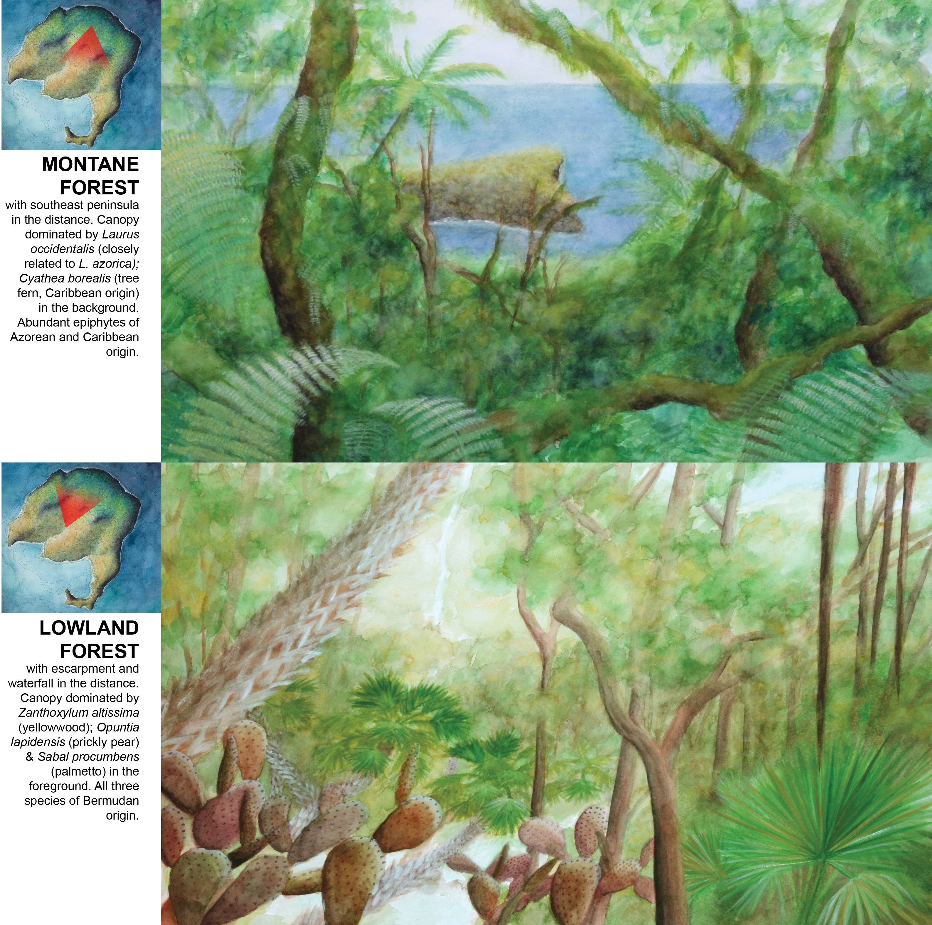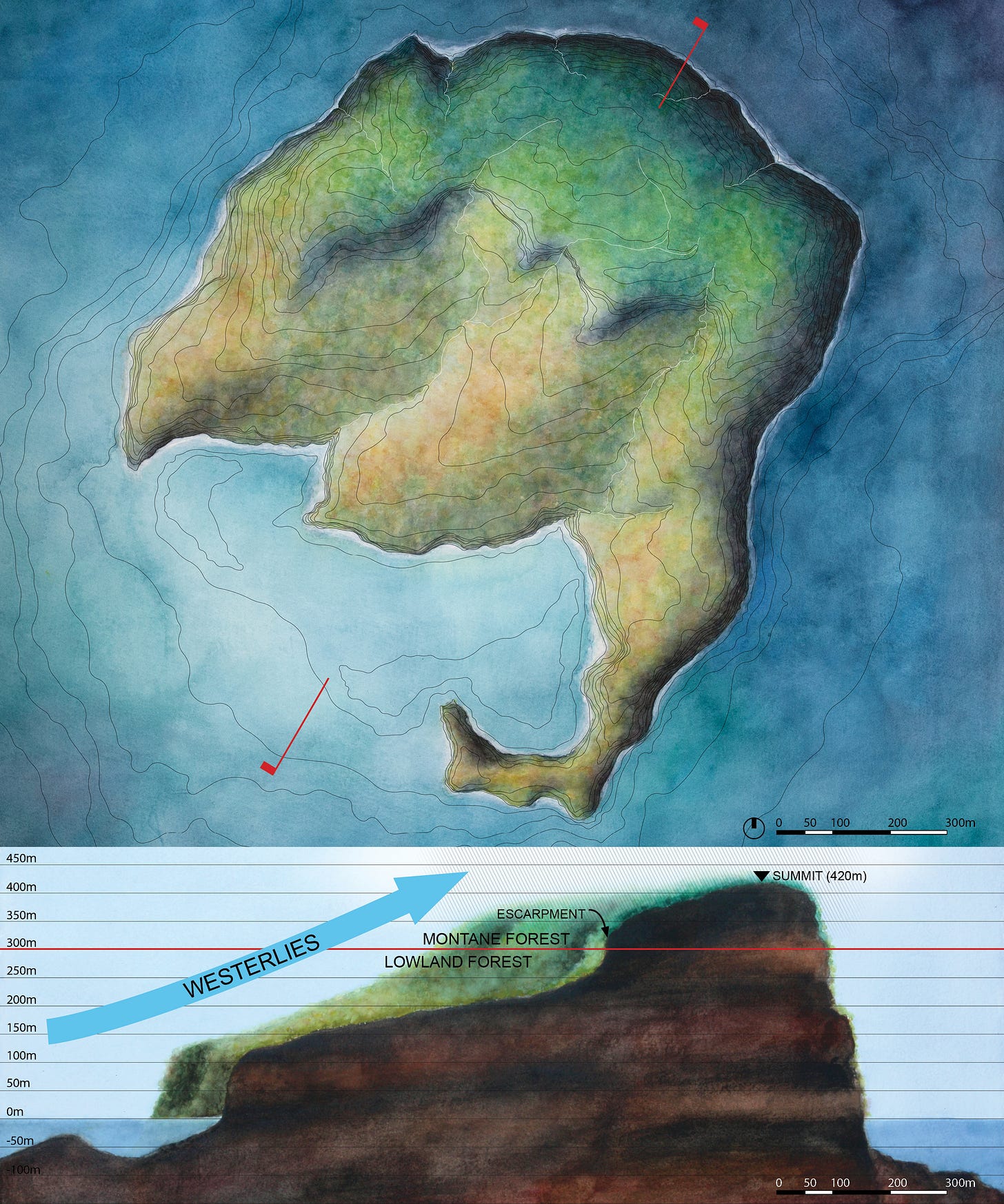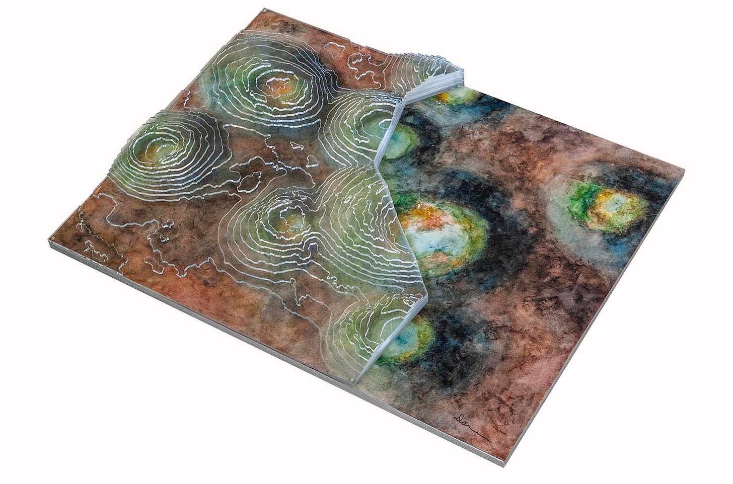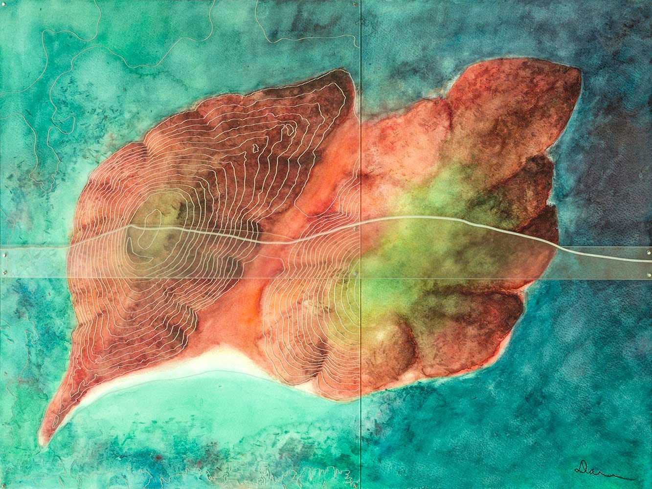 Most of the other islands are each represented only by a single work, and I stuck to plan view for the painting components. With watercolor being a new medium for me I think I still wasn’t comfortable inventing and then competently rendering views from other vantage points. If I included any 3D information at all, I captured it in the model/overlay components. Informally I call this my “Isolations” series. The majority of these designs are the product of artist residencies in Iceland and on Flinders Island off the coast of Tasmania, inspired by landscapes there with varying degrees of imagination and idealization.