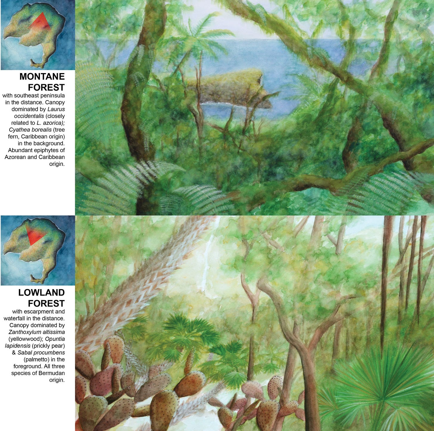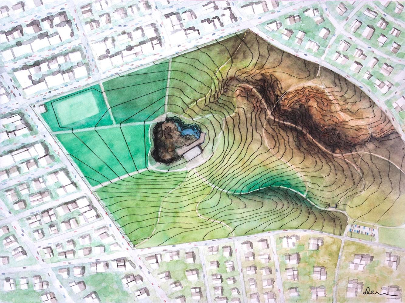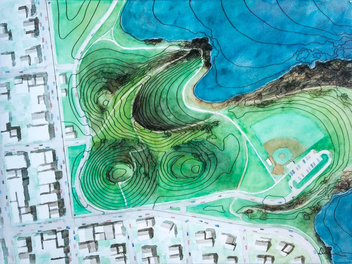 Despite the shift in dimensions (and medium) though, the plan-view watercolors would essentially end up merging with the earlier perspective-based montages, eventually kicking off the mosaic watercolor maps that I’m making now. I can trace that back to one particular work that I’ll describe in an upcoming post. It’s another one that came out of the residency on Flinders Island, inspired by that extraordinary national park which I’ll be gushing effusively about….