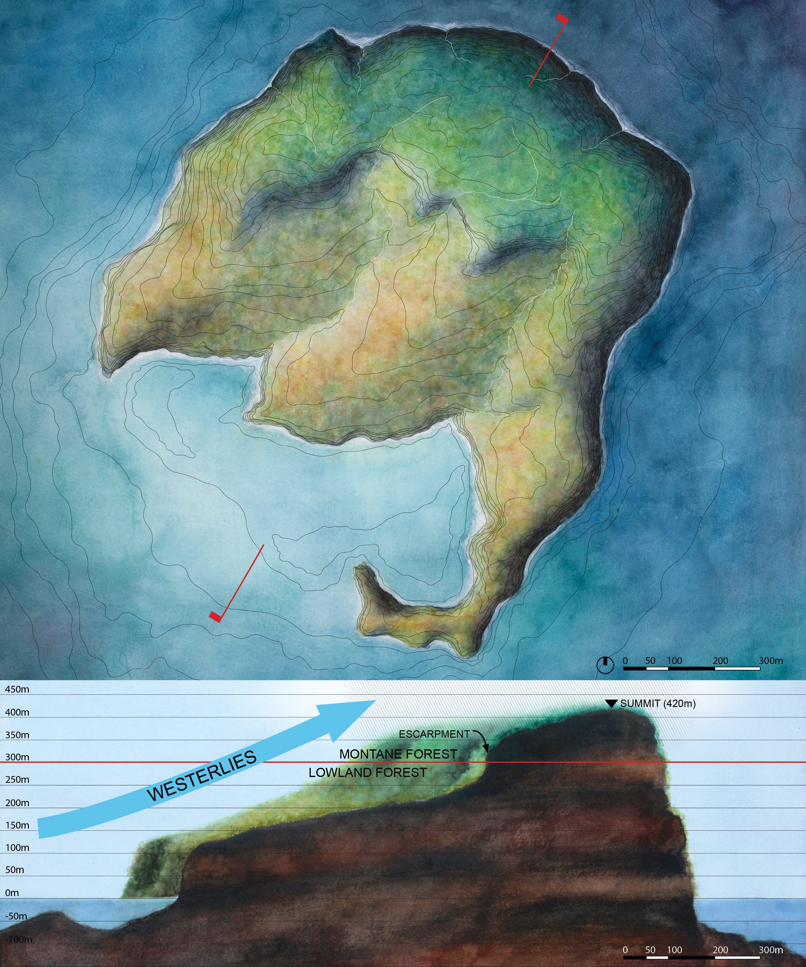 Two of these designs were Saucer Island and Shark Fin Island, each represented in a series of views at multiple scales as in a typical design project. I imagined both of these oceanic islands as compressing a crazy (i.e. impossible?) amount of ecological/climatic diversity into a tiny area, nesting together two of my island types: islands created or defined by conditions “from above” (e.g. precipitation) and “from below” (e.g. the ocean).